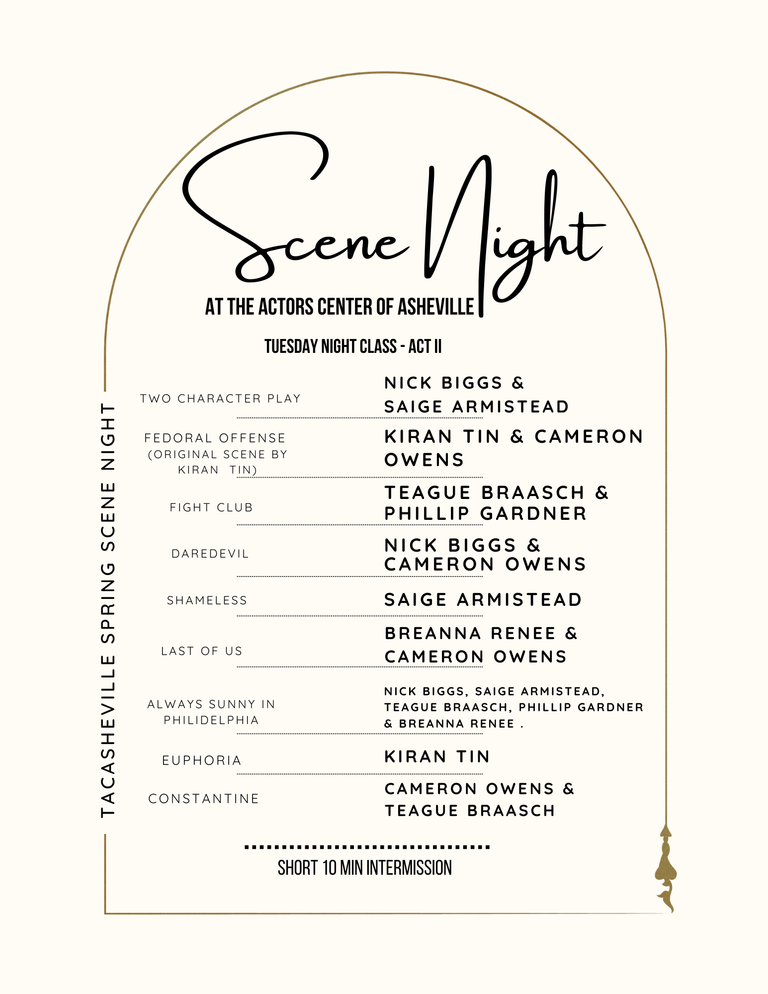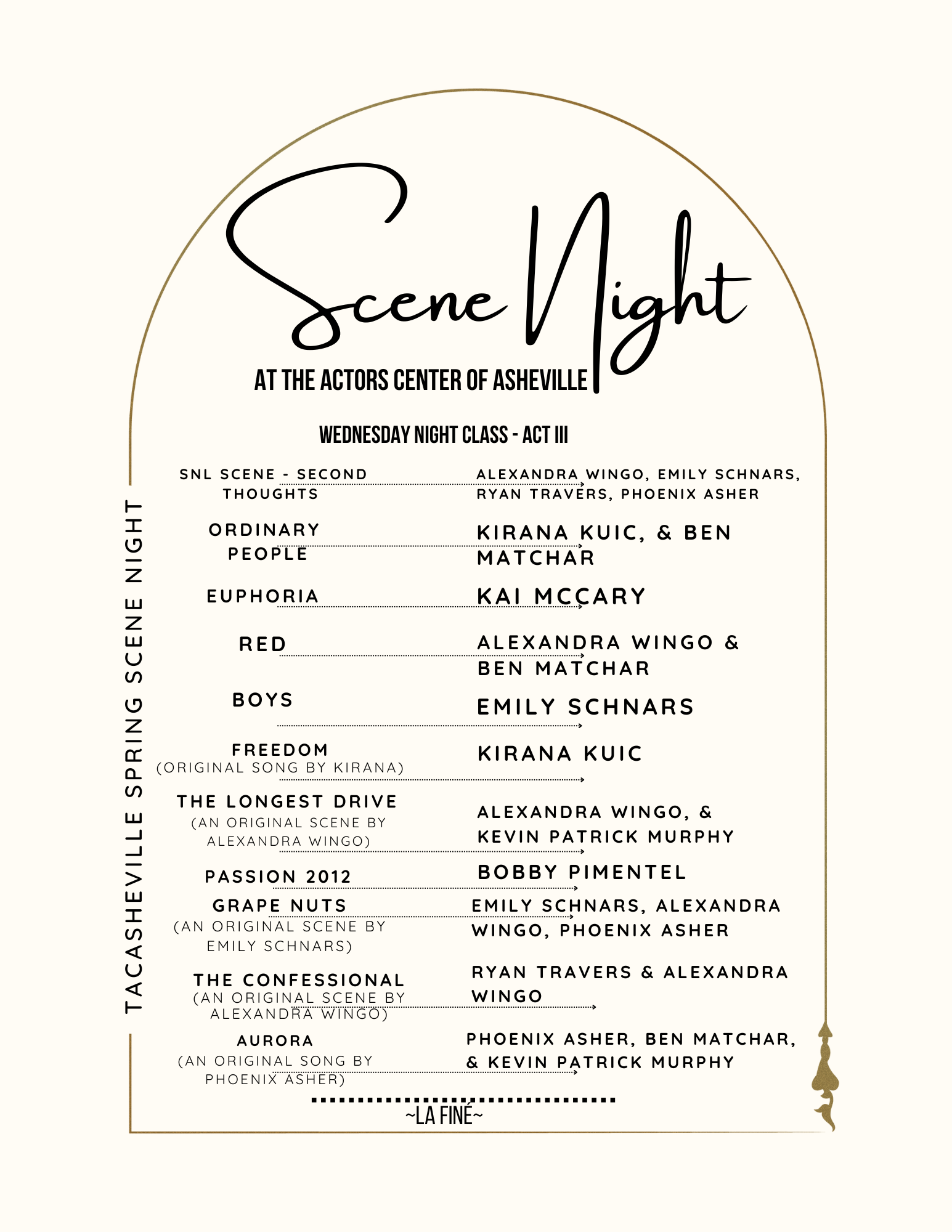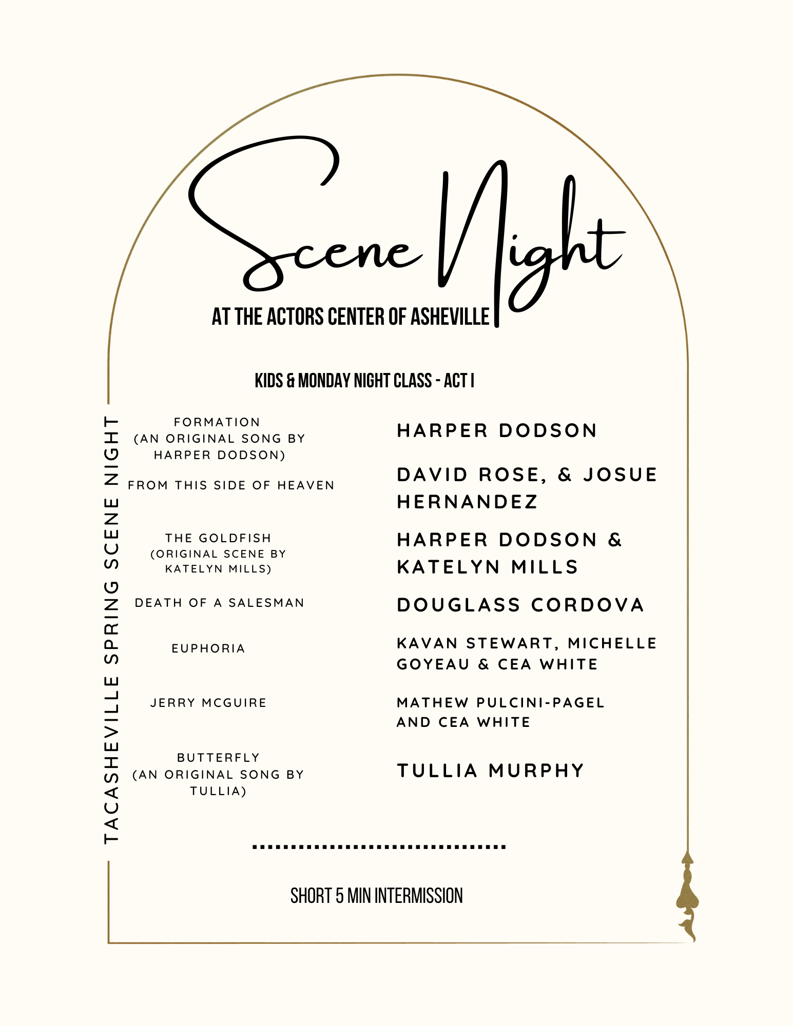 Welcome to The Actors Center of Asheville Spring Scene Night! Below is the program for this evenings 3 Act event beginning at 6:30pm. Share this: Click to share on X (Opens in new window) X Click to share on Facebook (Opens in new window) Facebook Like Loading... Related Published by Kevin Murphy Professional Actor, Coach and Teacher. View all posts by Kevin Murphy
