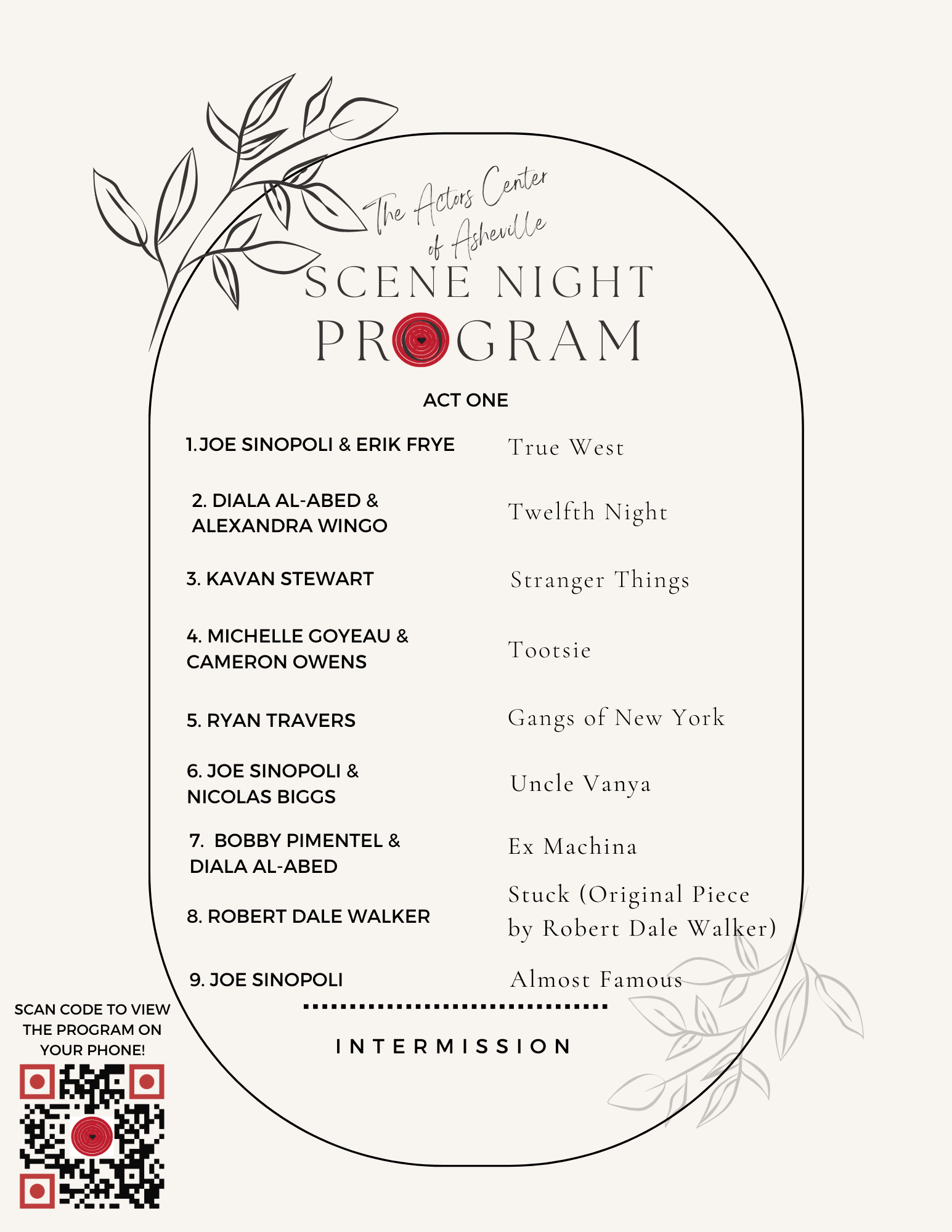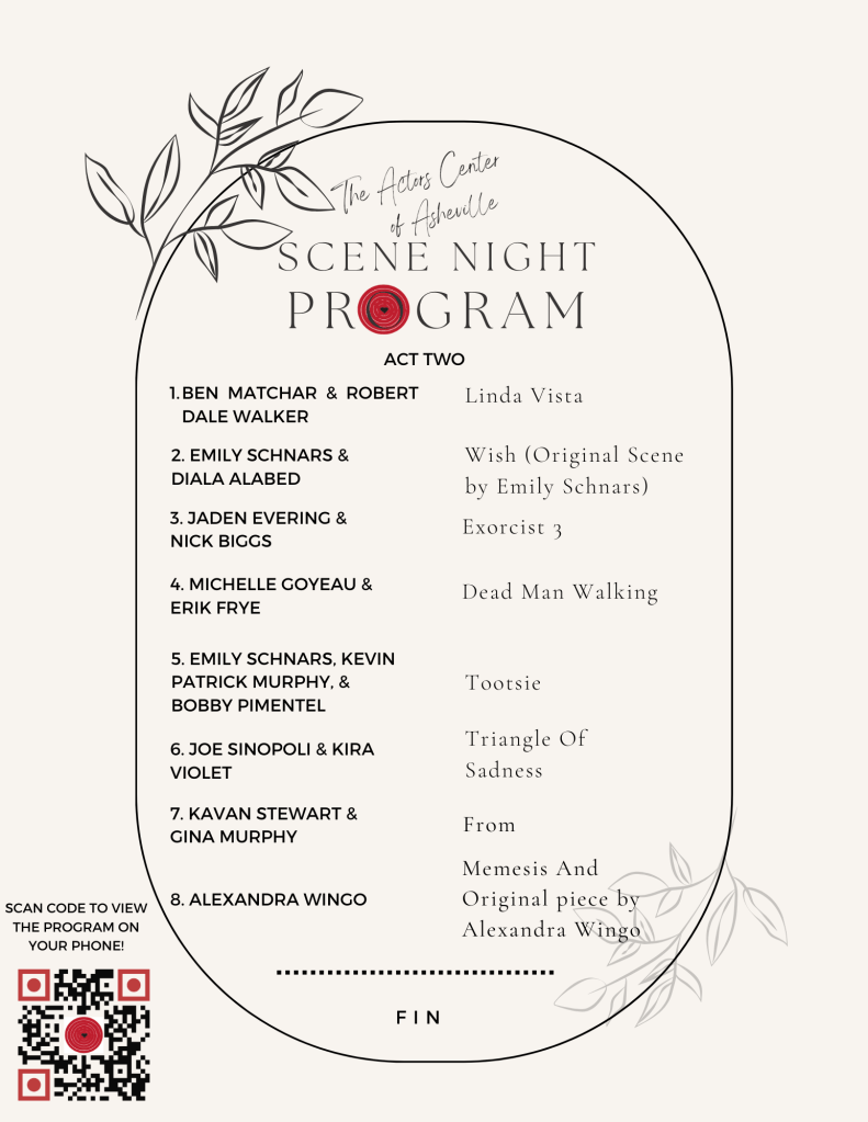 Welcome to The Actors Center of Asheville Winter Scene Night! Below is the program for this evenings 2 Act event beginning at 7pm. Share this: Click to share on X (Opens in new window) X Click to share on Facebook (Opens in new window) Facebook Like Loading... Related Published by Kevin Murphy Professional Actor, Coach and Teacher. View all posts by Kevin Murphy